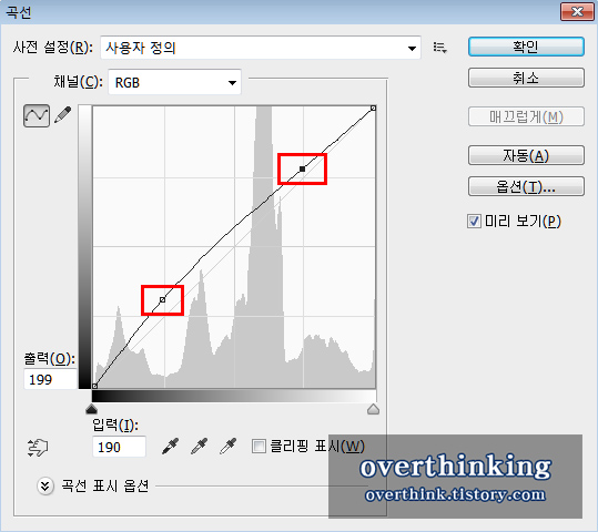 곡선을 해당 모양으로 바꾸어 주면 조금 밝게 변경이됩니다.
