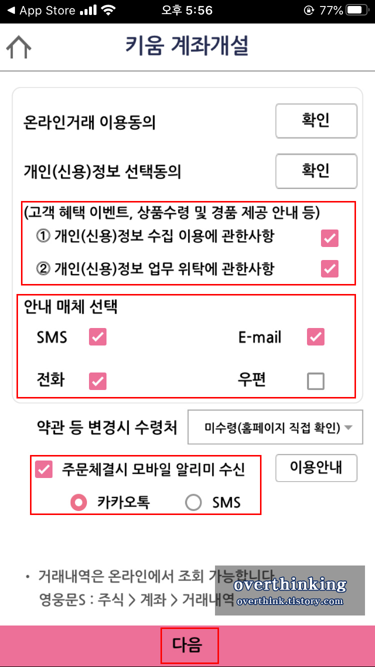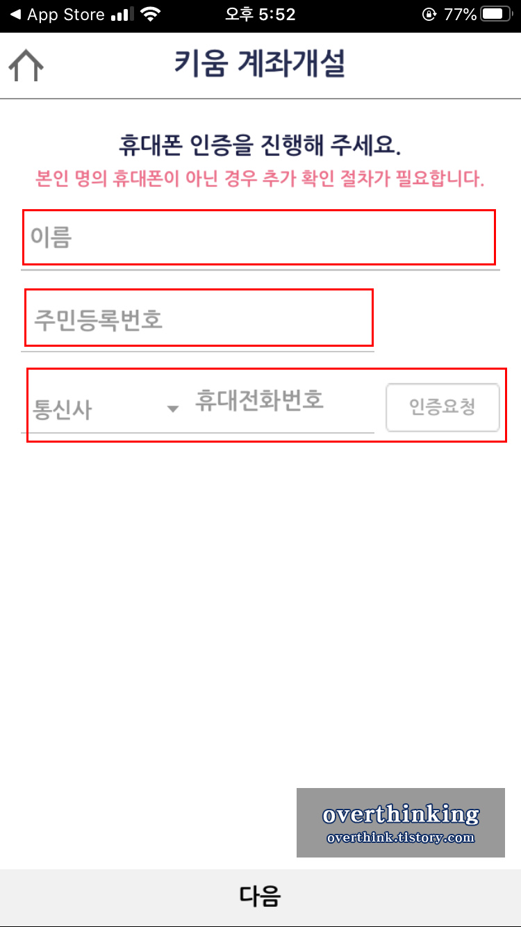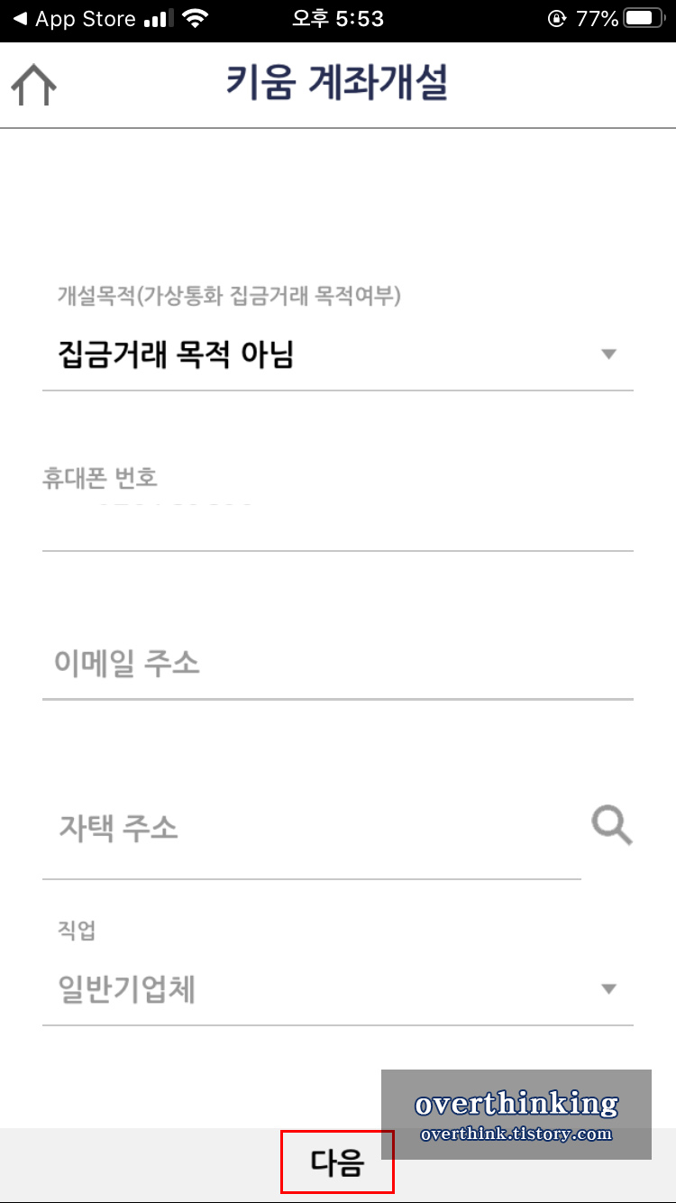 그리고 개설목적과 본인의 정보를 입력한 뒤 [다음] 을 클릭합니다.