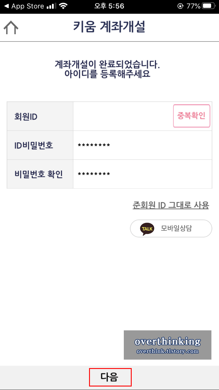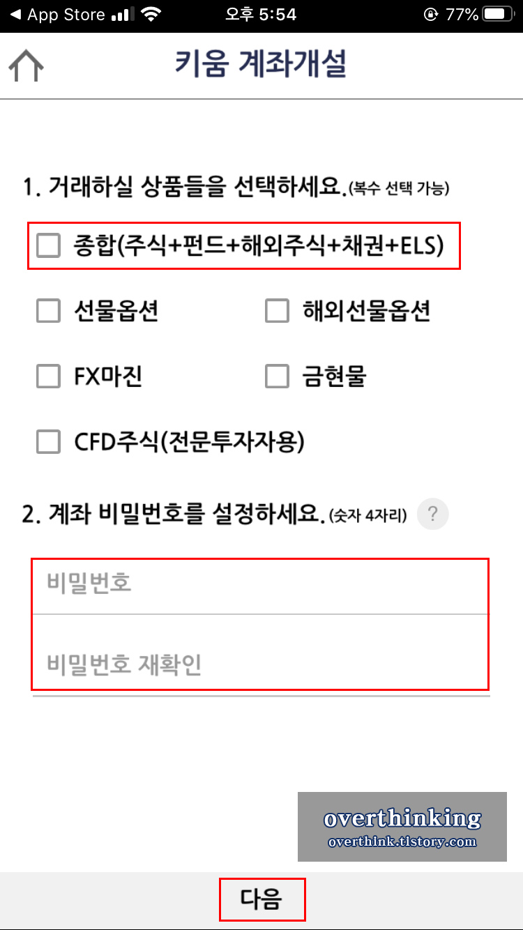 계좌 비밀번호는 4자리입니다. [다음] 버튼을 클릭합니다.