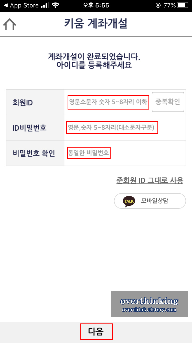 계좌의 개설은 완료되었으며 사용할 회원ID와 비밀번호를 입력해주세요.
